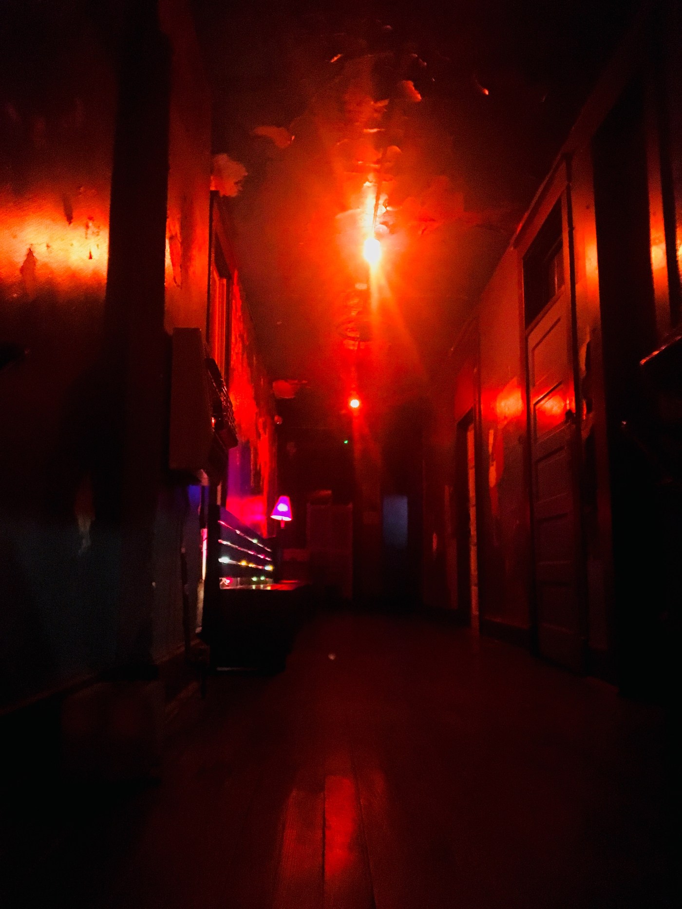 As it got later and a blues band began playing, the bar started to take on new life. As good as the band was, I was eager to check out the second story so I ventured up the stairs. If I thought the downstairs was creepy, upstairs felt like walking into a horror movie. Or at least taking a step back in time. What was once the brothel is now a few different lounge rooms, each cast in eerie red or blue lighting and with paint peeling off their walls.