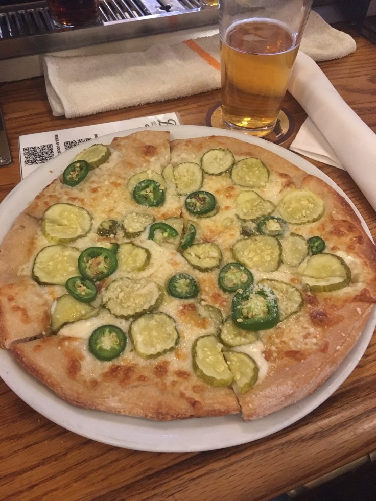 While exploring historic downtown Frederick, I stopped for lunch at one of the historic sites on the self-guided walking tour, which also happens to be a brewery! Brewer’s Alley is known historically as the location where a ransom was paid to Confederate General Jubal Early to prevent the destruction of Frederick. I made an interesting pick off their menu for lunch – Pam’s Spicy Pickle Pizza, topped with garlic oil, shredded mozzarella, sliced dill pickles, jalapenos, and parmesan – and paired it with their light and refreshing Kölsch.