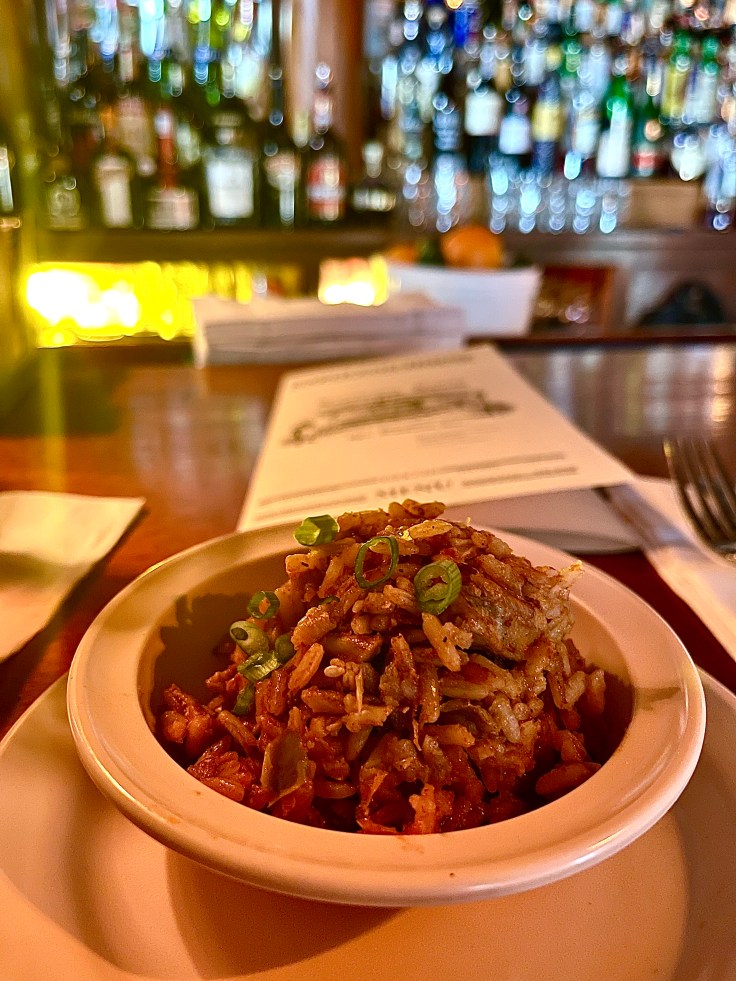Jambalaya is a favorite Cajun-Creole rice dish full of meats, vegetables, and lots of spice. While enjoying my muffaletta at Napolean House, I overheard the bartender telling the couple sitting next to me that their jambalaya could be served in 3 scoops as a main dish or in 1 scoop as a little side dish, so I decided to add the side dish version on to my meal, and it was yummy!