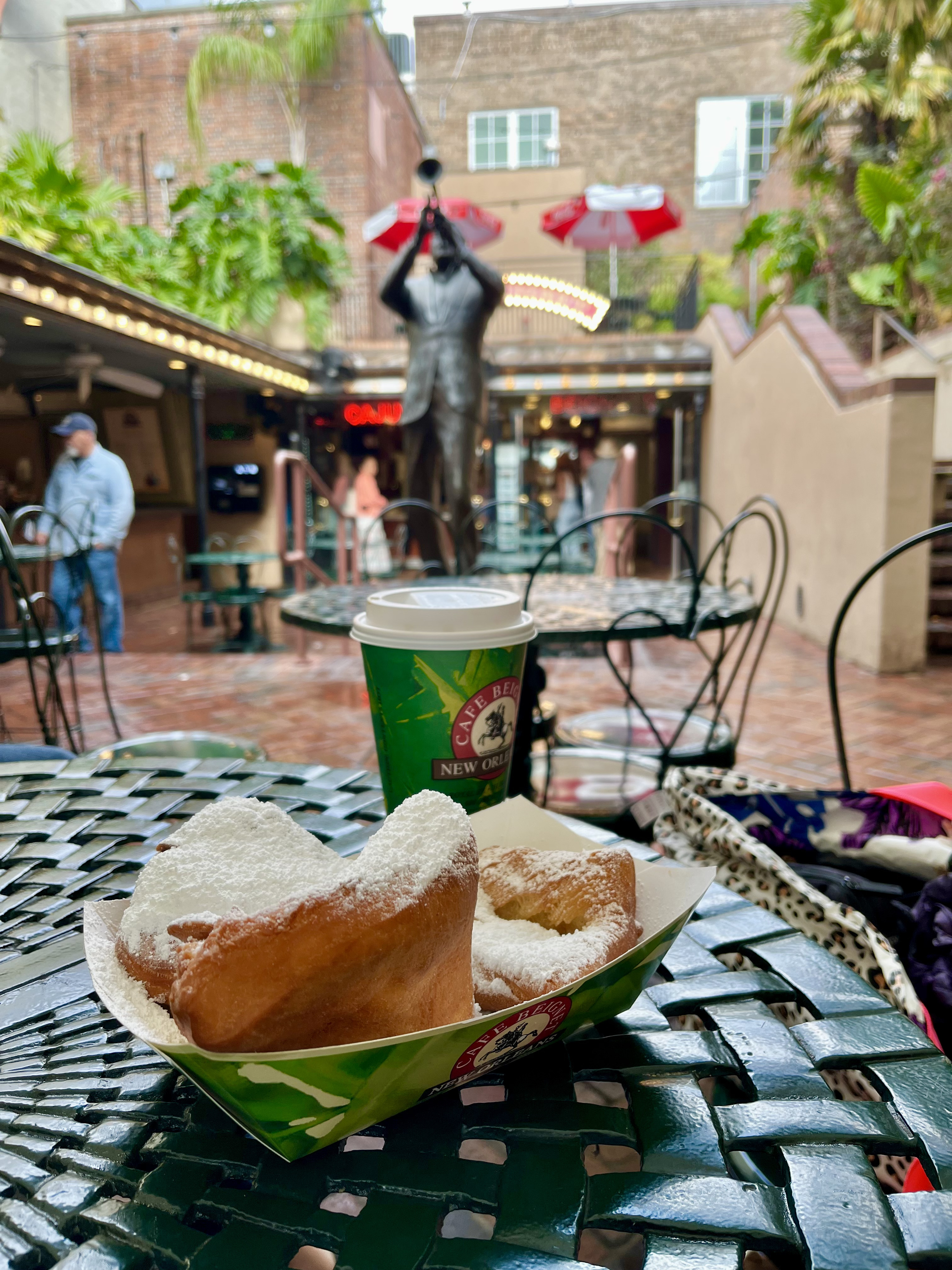 In addition to beignets, another “must” to try at Cafe Du Monde is the chicory coffee. This coffee is made with chicory root, which gives it a slightly nutty flavor. This tradition was said to have become popular in New Orleans during the American Civil War, when naval blockades disrupted the coffee trade into New Orleans and Louisiana natives turned to adding chicory to their coffee to stretch out their supply. Today it’s best enjoyed with an order of sugary beignets at Cafe Du Monde!
