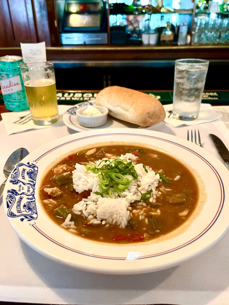 During my French Quarter sightseeing I stopped into the Hermes Bar at Antoine’s Restaurant for lunch, and had a bowl of their delicious seafood gumbo and some French bread. Gumbo is the quintessential stew dish of New Orleans, made with a roux, meats and/or shellfish, and the “holy trinity” of Creole cuisine: onions, bell peppers, and celery.