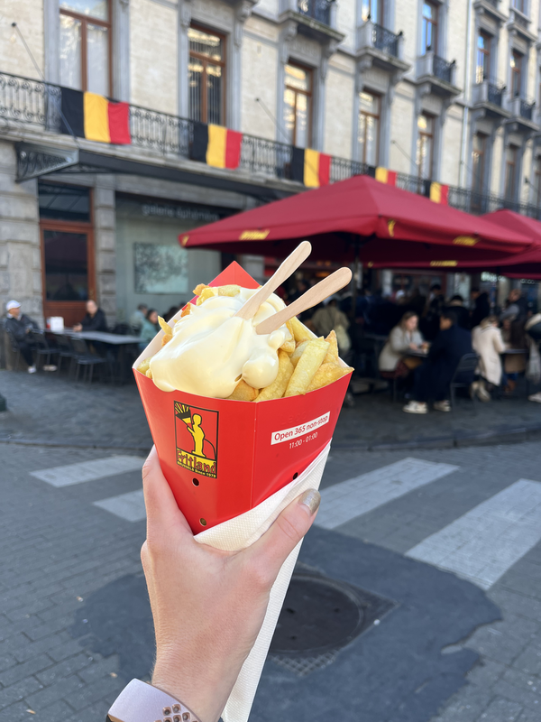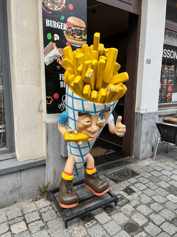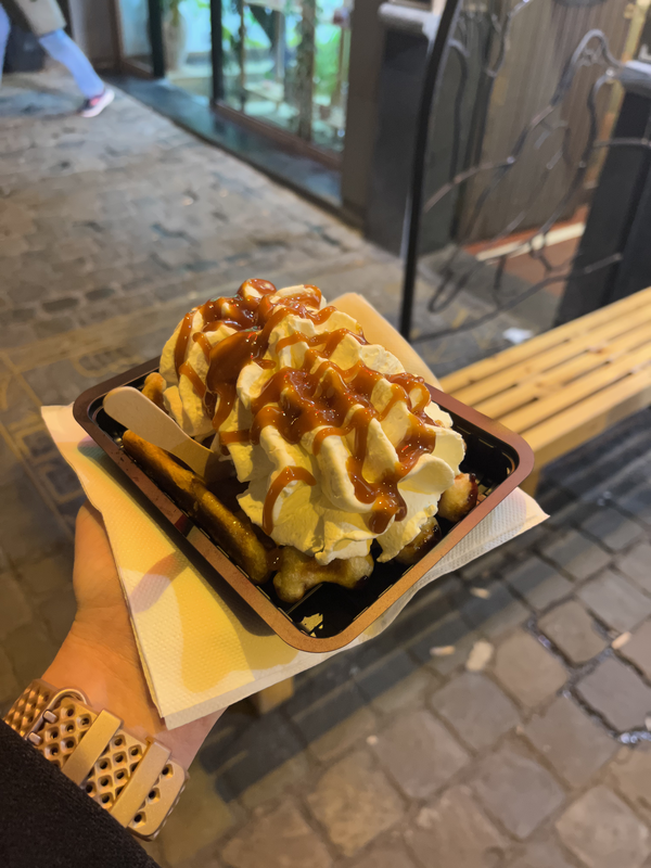 Wander any of the commercial corridors of Brussels in the evening and you’re bound to be tempted by a storefront with display cases full of waffles with just about every combination of sweet topping you can imagine: chocolate, peanut butter, nutella, bananas, strawberries, raspberries, whipped cream, powdered sugar, caramel drizzle. Yum! I went for a walk one night and got one with whipped cream and caramel. So good!