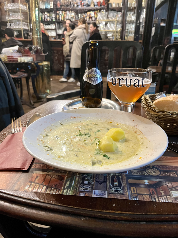 I didn’t have to venture far to try another traditional Belgian dish. Right next to my hotel was a restaurant well-known in Brussels called Le Cirio. The interior of the restaurant was gorgeous and warm, with an Art-Nouveau style and dark wood trimmings. Just as warm and homey was the dish that I had here: waterzooi. This dish comes from the Flemish northern region of Belgium, and is a stew usually containing fish or chicken, carrots, onions, celery, leeks, potatoes and herbs such as parsley, thyme, bay-leaves and sage.