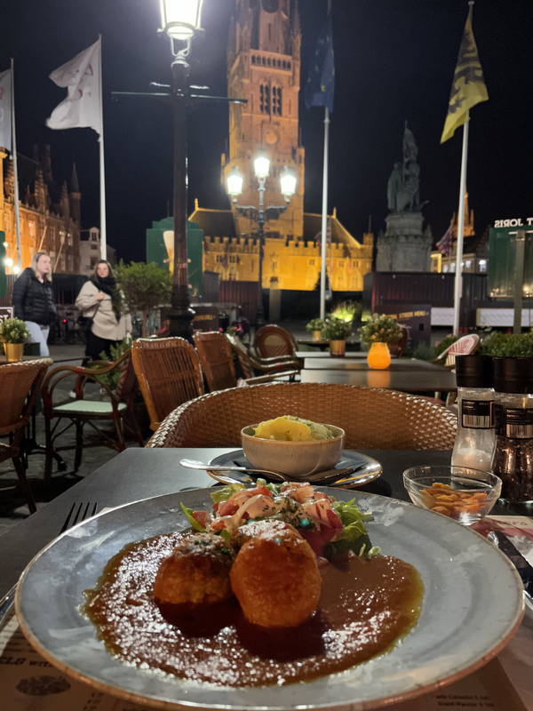 After leaving the Lucifernum it was time to get some food to soak up those strong cocktails. I went back to Market Square for a delicious dinner of meatballs at the Hotel Central’s outdoor restaurant. I washed it down with a Stella Artois – I know, I drink Stella all the time in the U.S. but it definitely hit differently enjoying it with a view of the Markt in the heart of Bruges.