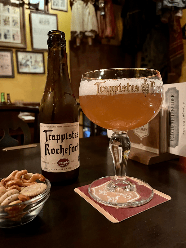 In a quirky bar called Poechenellekelder decorated in puppets and located directly across from Brussels’ famous Mannekin Pis statue, I stopped in and had a Rochefort Triple Extra. The Rochefort Abbey dates back to the 13th century in Rochefort, in the province of Namur, Wallonia. The Rochefort Triple Extra is a newer beer that Rochefort just started brewing in 2020 which commemorates an earlier beer brewed in the 1920s. It’s 8.1% and is a strong pale triple ale with notes of spice and citrus.