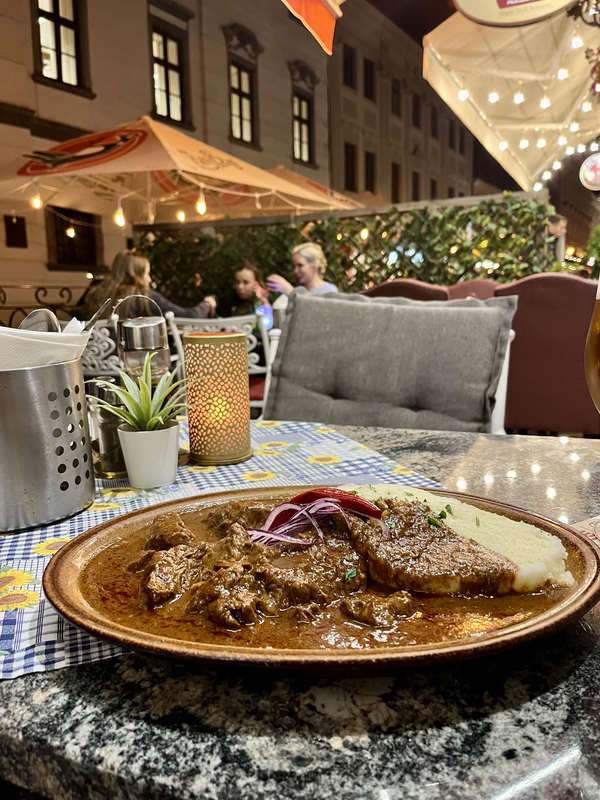 On my second night in town, the weather was nice and I had no dinner plans, but was enticed by all of the al fresco dining along the Michalská pedestrian street. I selected Grand mother’s restaurant at random and settled in at a cozy table. I ordered hovädzí guláš s knedľou, or beef goulash, a dish that is popular throughout the region. Goulash in Slovak is prepared similarly to Czech goulash, as a thick beef stew served with bread dumplings and topped with onions. I paired it with a Bakalář Czech lager.