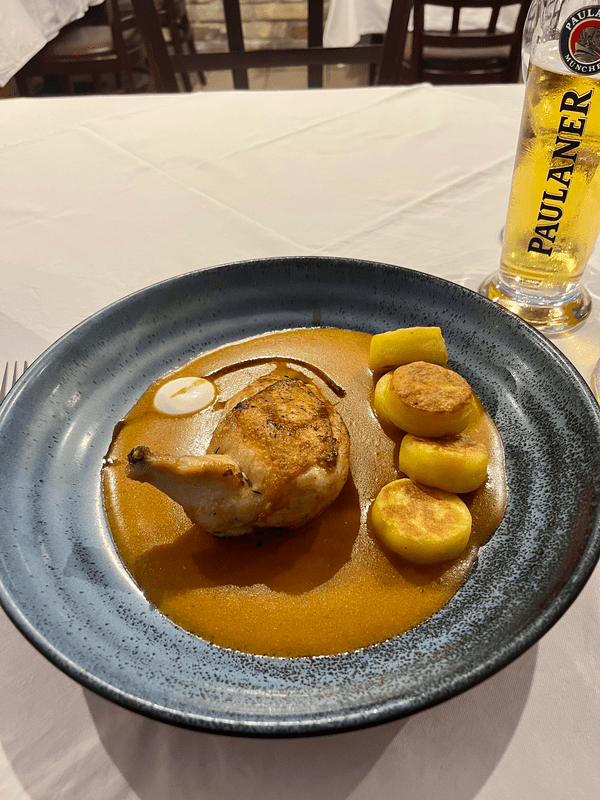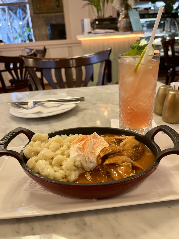 The cafe is elegant and bright and a great spot to experience classic Hungarian fare. Upon my arrival to Budapest and after checking into my hotel, I headed here for a lunch of csirkepaprikás (chicken paprikash) with butter noodles. Chicken paprikash is a traditional dish consisting of chicken simmered in a creamy paprika sauce.