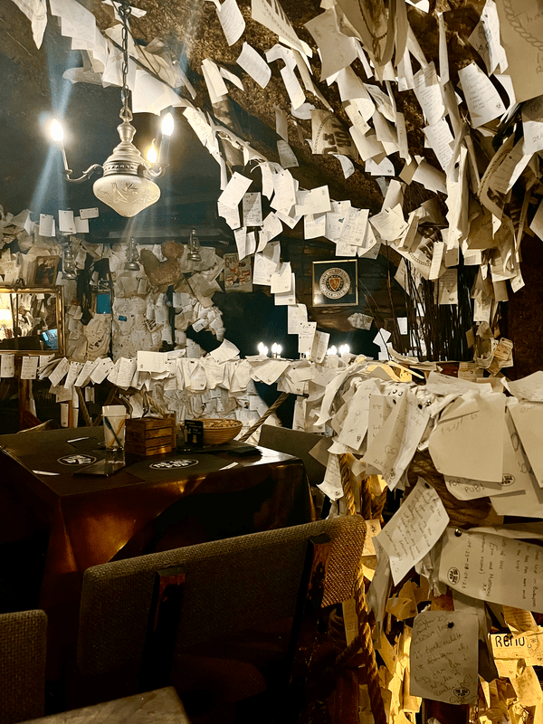 For Sale Pub is a small bar with its walls covered in traces of its patrons: you can pin drawings, business cards, and notes on the wall to leave your mark. The floor is covered in straw, and you are given a bowl of complimentary peanuts which you can shell right onto the floor. I was seated in a cozy corner upstairs, perfect for dining and enjoying the live music coming up from the first floor without it being too loud. The goulash hit the spot. Hungarian-style goulash is a soup with beef, vegetables, and of course plenty of paprika. The dish has its origins in Hungarian cattlemen who were often camped out for days tending to their cattle and had to eat what they could easily carry and prepare in a single pot.