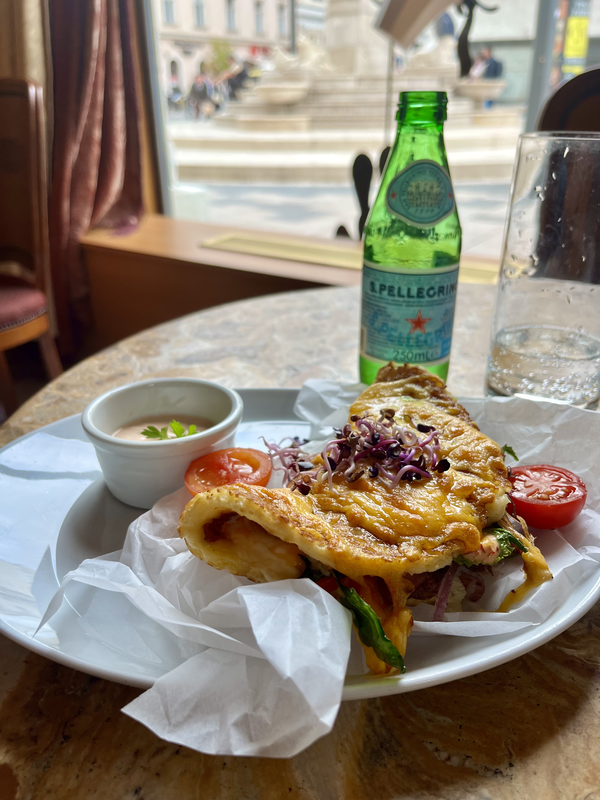 On my last day in Budapest, I was catching a train to Vienna around noon so I had time for a little morning walk and decided to take myself out for a hearty breakfast. I found Cafe Brunch on Google Maps not far from my hotel – they have several locations throughout Budapest but the one I ate at was on Fővám tér near Central Market Hall. It’s a cute small cafe offering all-day breakfast foods. I ordered the Omlett Magyarosan (Hungarian Omelette) which had Hungarian sausage, onion, spicy green peppers, and smoked cheese. It was delicious, and those peppers were definitely spicy!