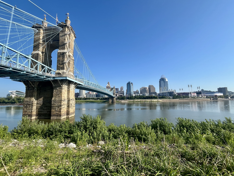 Early in the morning on my second day in Cincy, I ventured across the Ohio River to the Covington, Kentucky side, which offers great views of the Cincy skyline and the iconic John A. Roebling Suspension Bridge. John A. Roebling designed this bridge to span the Ohio River, and at its opening in 1867, it was the longest suspension bridge in the world. It would later be overtaken in 1883 by Roebling’s more famous piece – the Brooklyn Bridge. The Riverfront Commons Trailhead at the base of the bridge on the Covington side offers parking and is a great photo opp spot.