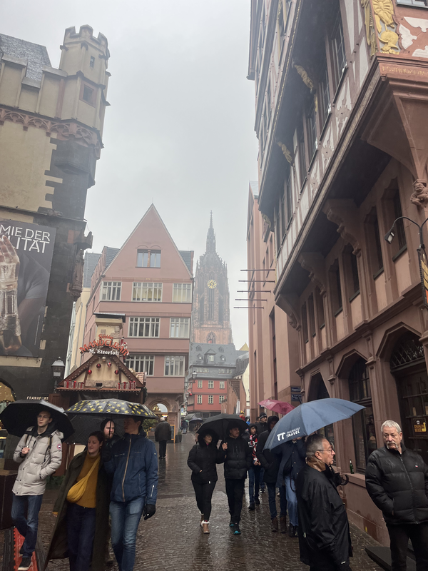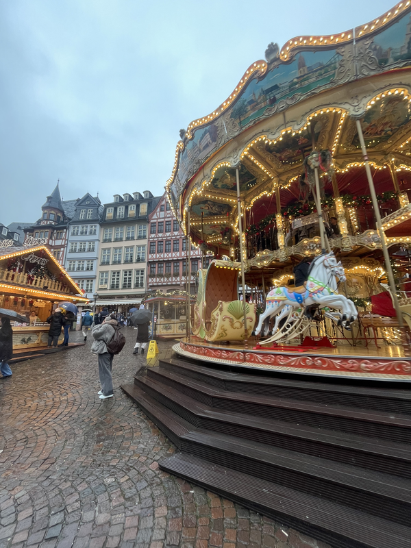 I stopped back to my hotel for a bit after wandering the museum to take a rest, and change into some drier clothes after being out in the rain all day. Then I headed out to fully take in the magic of the Frankfurt Christmas Market. The heart of the market is at the Römerberg, but the market spans for blocks, with other key vendor areas at Paulsplatz, Hauptwache, and the Mainkai down along the river. I started at the Hauptwache end since that was closest to my hotel. By the time I got to the Römerberg section, I was ready for some food. I enjoyed a bratwurst and some Kartoffelpuffer (potato pancakes).