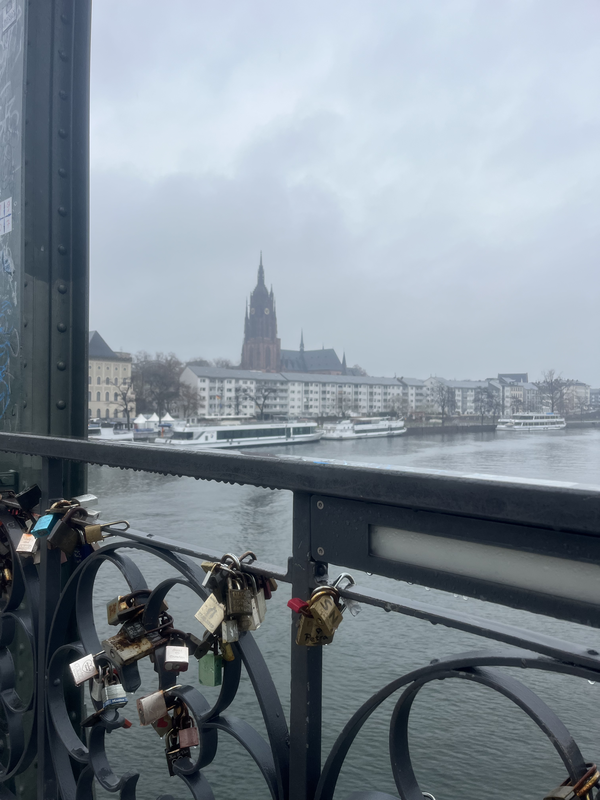 After lunch I strolled down along the River Main, the longest tributary of the Rhine that cuts through central Germany. It was a rainy day, so the walk was peaceful and I captured the perfect moment of some rowers making their way up the river in front of the Dreikönigskirche across the way. I next took a walk across the Eiserner Steg, an iron footbridge that serves as Frankfurt’s own “Love Lock” bridge and offers great views of the city. It’s well worth the walk – even in the misty rain!