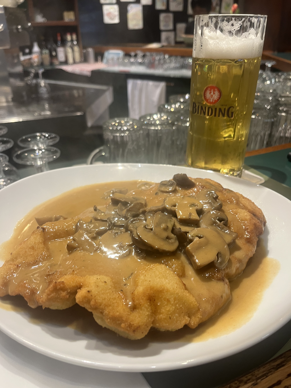 I stopped for lunch at Römer Pils Brunnen. This restaurant came recommended to me by a friend that’s spent time in Frankfurt before, and it was certainly the perfect restaurant for one day in Frankfurt. It serves up classic German dishes in a cozy tavern-like atmosphere. Sitting at the bar, I had the most delicious schnitzel, so large I couldn’t even finish it, and of course a tall refreshing glass of local beer.