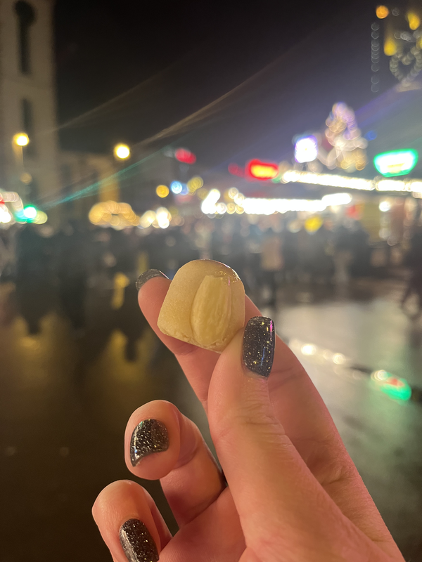 After hanging out for a bit, I started making my way back to my hotel, but with one last stop at a vendor in the Hauptwache for Bethmännchen, a German treat that originated in the Frankfurt area. These little pastries made of marzipan, almond, powdered sugar, rosewater, flour and egg are a Christmastime favorite in Frankfurt. Not only were they tasty, but this part of my visit to the Christmas market is memorable because after a full day of bopping around Frankfurt, I finally felt confident enough in my German to order and pay for drei Stücke (three pieces) in German without having to switch back to English at all in my exchange with the cashier. Thanks, Duolingo!