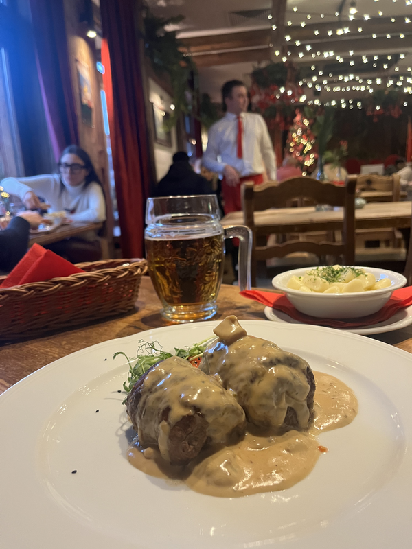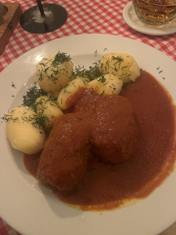 After the Warsaw Rising Museum, I ventured to Restauracja Polska Czerwony Wieprz. This is one of Warsaw’s oldest and most notable restaurants, having seen many celebrities come through its doors. It’s also where early Polish communists gathered to discuss revolution, and legend has it Vladimir Lenin frequented it as well. The restaurant has a tongue-in-cheek communist theme and serves up dishes from the former Soviet Bloc era. I ordered the “Beef paupiettes a’la Marshal Tito,” a favorite dish of the “benevolent dictator” of Yugoslavia.