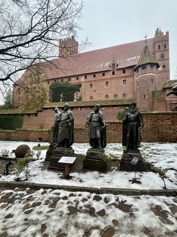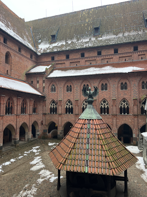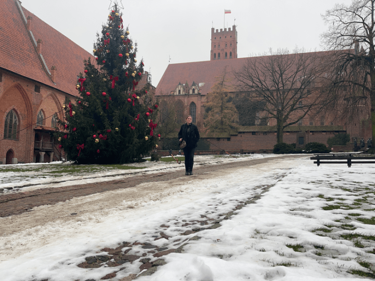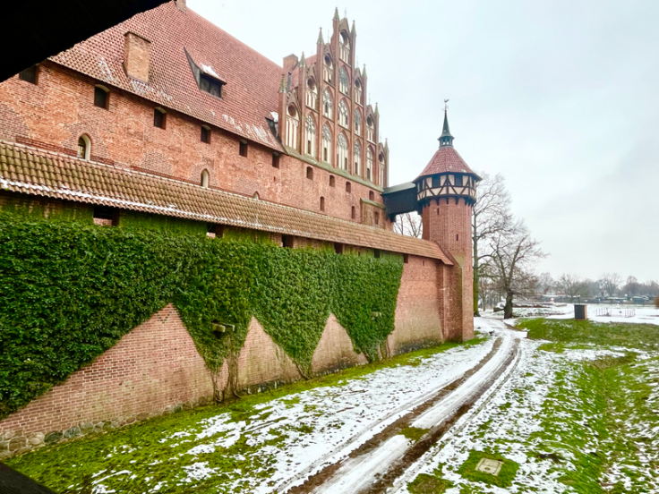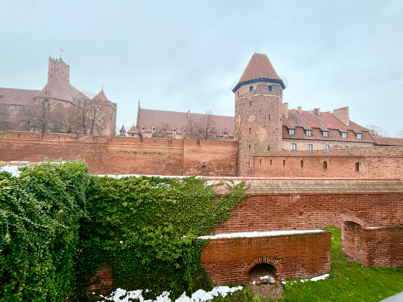 I took a morning train to visit Malbork for a day during my stay in Gdańsk. There are intercity trains that run from Gdańsk to Malbork, getting you there in just about 30 minutes. During the season I visited, the castle opened at 9am each day, so I took an 8:30 train out of Gdańsk, with about a 15-minute walk from the station in Malbork to the castle. It was early December, and the weather in Gdańsk had been pretty cold with a light misty fog in the mornings. As the train chugged out of the city and into the countryside, it was to my delight to see fields covered in snow – and it would make for some beautiful photos once I arrived at a snow-dusted Malbork Castle.